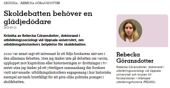 Forskarskolans doktorand Rebecka Göransdotter har publicerat en artikel om utbildningshistoriens funktion i skoldebatten: ”Skoldebatten behöver en glädjedödare”